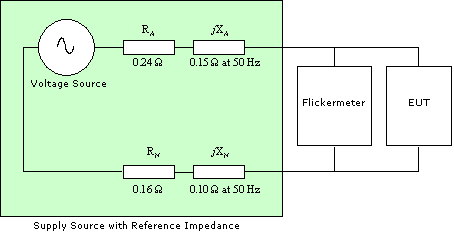The values of the reference impedances are most important in this measurement. When connected to the mains supply as in Figure 2, the flicker is caused by the voltage drop across the mains network impedances. In the flicker test, the reference impedances are representative of the network impedances. These values are defined in and should be stable. Any errors in the reference impedances will cause errors in the flicker measurement.