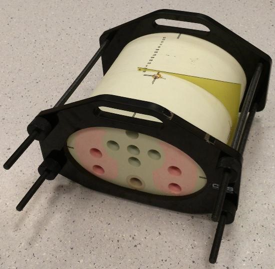 The alanine pellets are housed inside a Farmer shaped holder, which can be inserted into the CIRS thorax phantom. This means that you can perform a position check measurement using your own Farmer ionisation chamber prior to the audit measurements to ensure accurate setup.